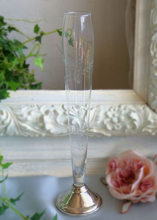 エッチングガラスとフォルムが美しいスターリングシルバーとガラスの素敵なフラワーベースです。